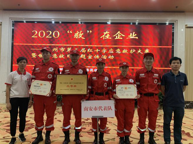公司由工會主席洪小婷擔任領隊,陳揚揚擔任隊長,雷惠萍、黃倩陽、洪鑫亮、李金藝為隊員組成應急救護小隊,代表南安市參加本次比賽。隊員們從零開始,歷經短短十天的培訓,在比賽當天操作嚴謹、動作嫻熟、配合默契,從11支隊伍中脫穎而出,取得團體三等獎及個人救護演講二等獎的佳績。