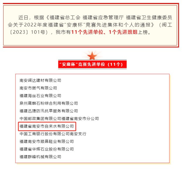 近日,根據《福建省總工會 福建省應急管理廳 福建省衛生健康委員會關于2022年度福建省“安康杯”競賽先進集體和個人的通報》(閩工〔2023〕101號),公司榮獲“安康杯”競賽先進單位榮譽稱號。