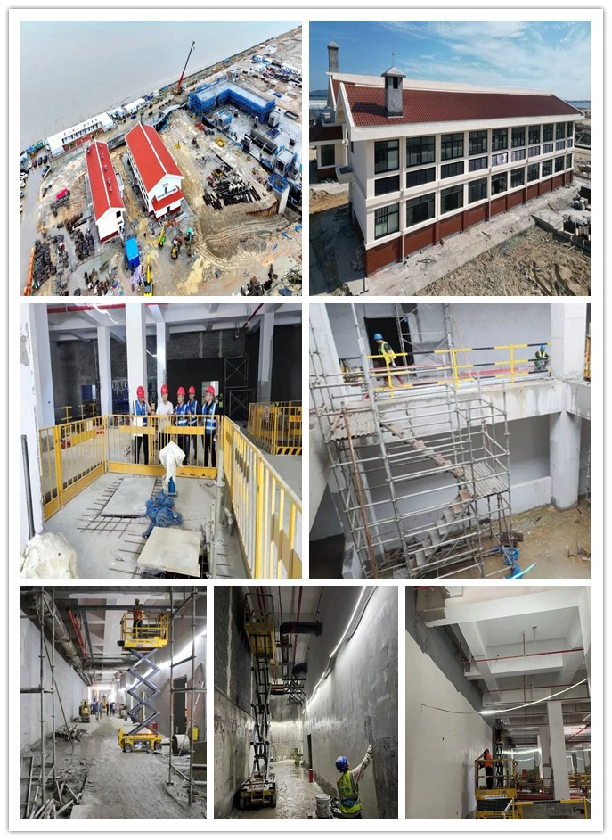 截至目前,該項目的綜合樓、宿舍樓完成全部塊料鋪貼、內外墻粉刷及鋁合金窗安裝等工作;一體化箱體完成全部滿水試驗,設備基礎完成70%,砌體工程完成80%,涂料工程完成30%,機電安裝工程完成50%,消防工程完成50%,通風工程完成60%;東側地下進出口通道完成主體結構施工;西側通道管道安裝完成70%;進水閥門井完成沉井施工;尾水管道敷設完成800米,排放口與深海排放項目5號泵站對接成功。