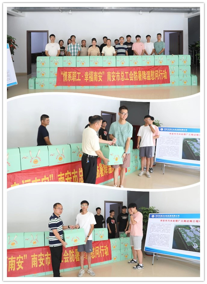 夏日炎炎,氣溫居高不下。7月11日上午,南安市總工會副主席黃文賜帶隊蒞臨市污水處理廠三期工程,開展“情系職工·幸福南安”2024年防暑降溫慰問活動,為奮斗在一線的廣大職工送去“清涼禮包”,市水務集團副總經(jīng)理黃志裕等陪同慰問。
