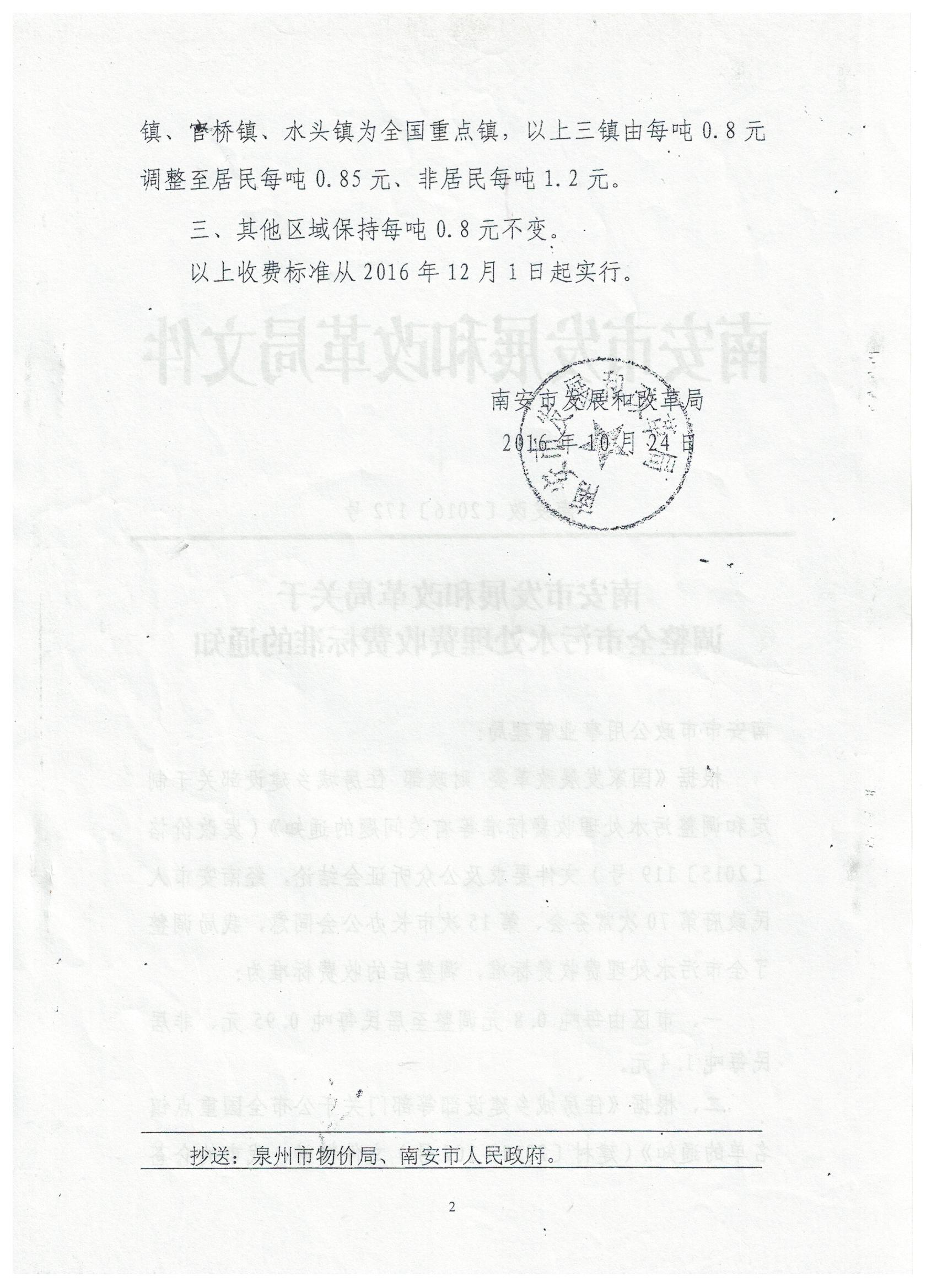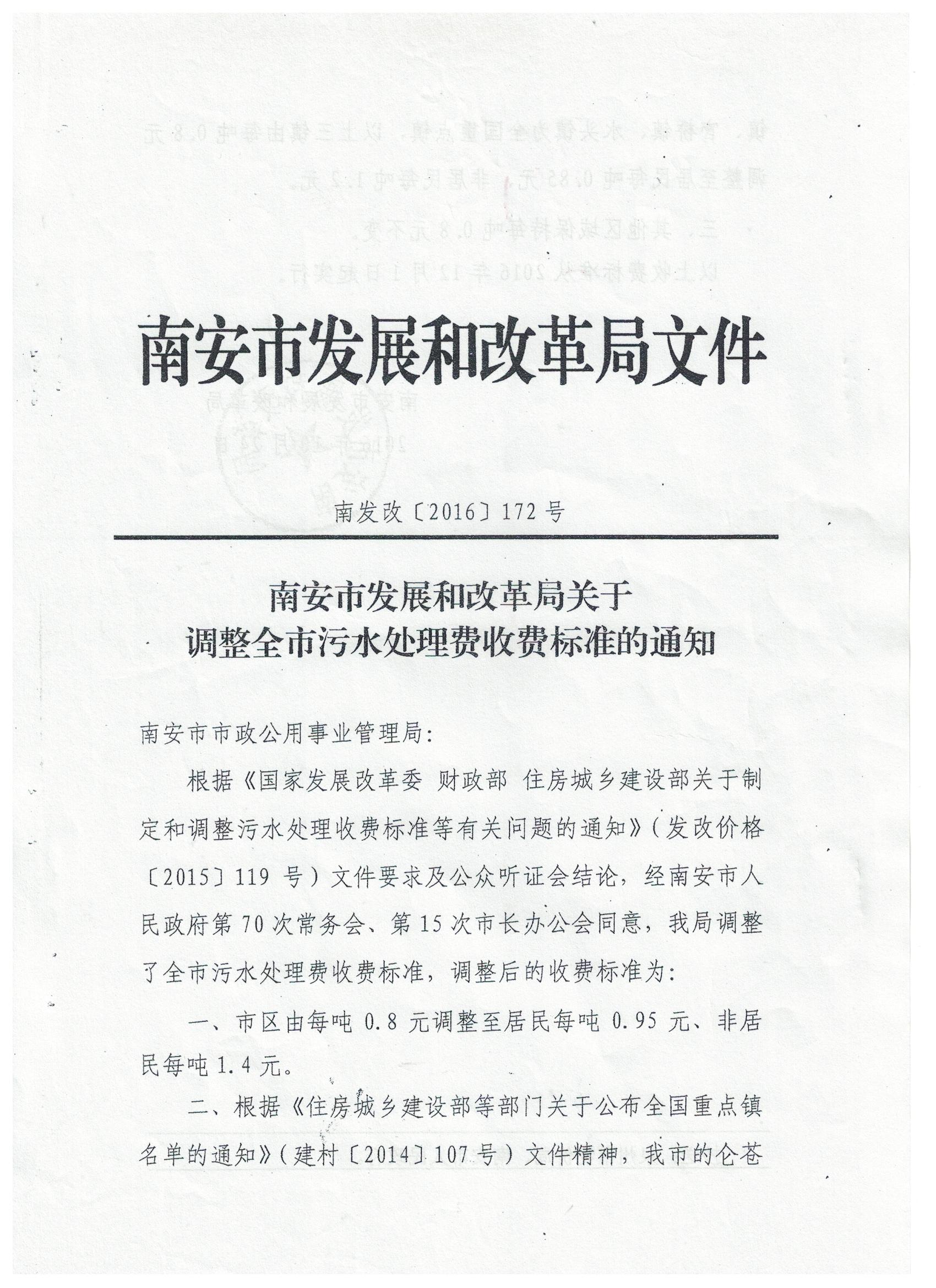 南安市發展和改革局關于調整全市污水處理費收費標準的通知