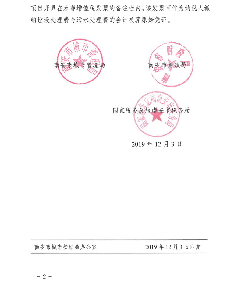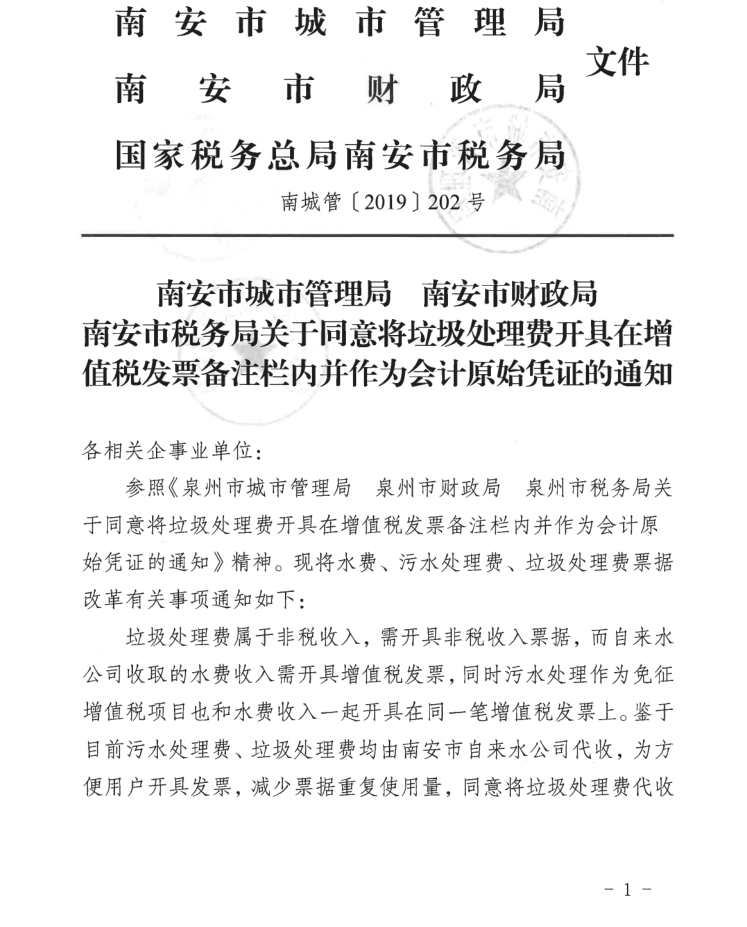 根據《南安市城市管理局 南安市財政局 南安市稅務局關于同意將垃圾處理費開具在增值稅發票備注欄內并作為會計原始憑證的通知》(南城管[2019]202號)文件要求,2020年1月1日起,本公司所代征垃圾處理費將開具在增值稅發票備注欄內,污水處理費開具在增值稅發票上,并作為會計原始憑證。