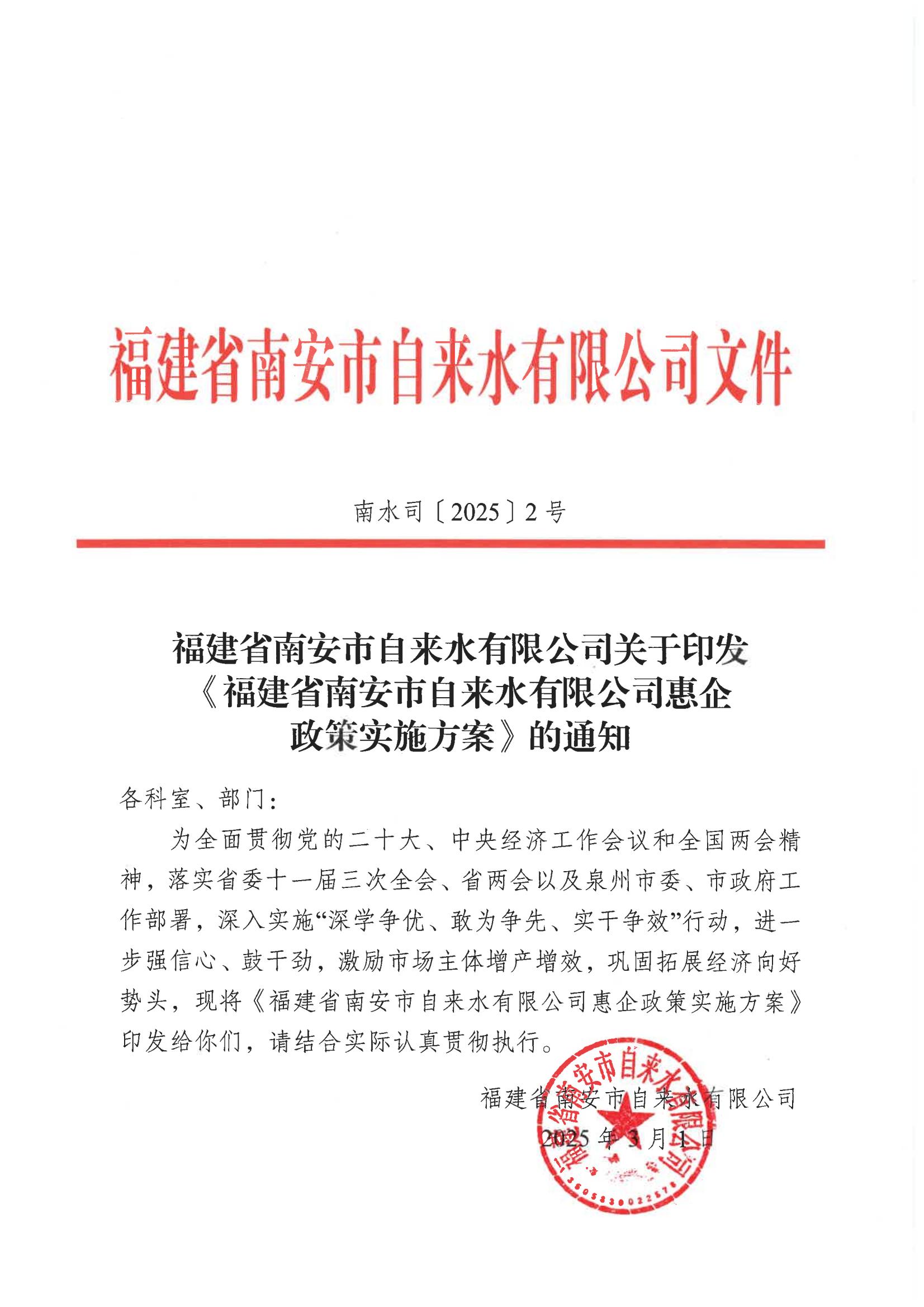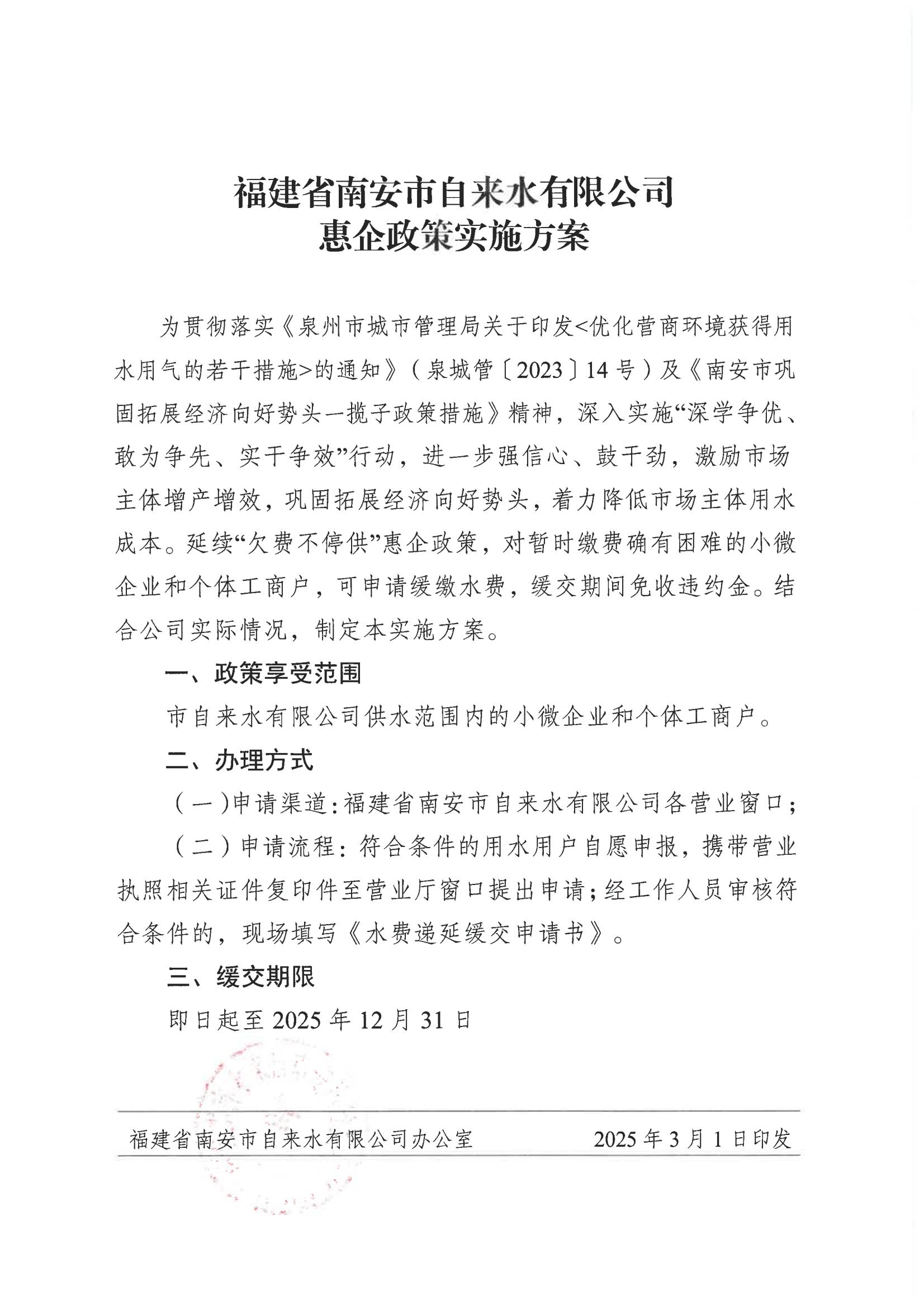 福建省南安市自來水有限公司關(guān)于印發(fā)《福建省南安市自來水有限公司惠企政策實施方案》 的通知